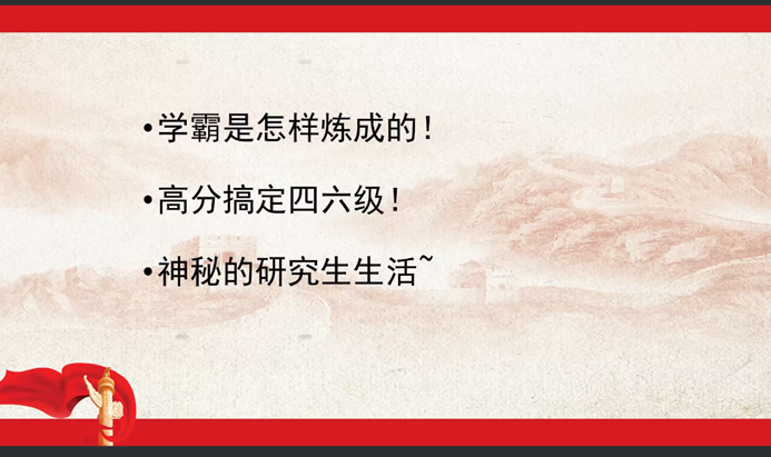 会议伊始,学姐将“充满荣光,写满梦想”的美好祝愿送给大家,借王国维所写的读书三境建议同学们学会苦中作乐。追寻兴趣、遵从本心、平和心态三点内容的讲述干货满满,激励大家跟着感觉走,趁着还年轻、试错成本低的时候多尝试,不断寻找内心所爱。随即,学姐言传身教,从自身经历角度分享了自己学习英语的心得,鼓励大家根据自身情况尽量参加一些有意义的竞赛。最后,她简单概括了自己的研究生生活及其体会,提问环节中同学们或是踊跃连麦,或是以一条条跃动的弹幕,提出自己的问题。学姐耐心回答,切切实实地解决了大家的疑惑,令人受益匪浅。至此,本次学姐分享说活动宣告结束。
