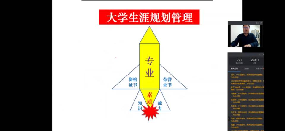 程胜利向同学们详细介绍了MBTR等模型,帮助同学们更好地了解自己。程胜利指出职业生涯规划的意义分为两点:对内可以找到自己快乐的来源,更好的扬长避短,获得自信心,促进自我实现;对外可以能动地适应环境,创建和谐的人际关系,有效地整合并利用资源,为社会创造更多的价值,为党和国家的事业贡献更多的力量。