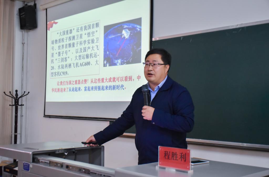 八百里彩旗飘飘,九万里风鹏正举。程胜利以习近平新时代中国特色社会主义思想为依托,对中国所处在的历史方位做出了分析,科技上大国重器的建设,经济上GDP的高速稳定增长,外交上的稳中求进都是中华民族从站起来到富起来再到强起来艰辛历程的有力见证。在发展过程中我国仍面临发展质量不够高、创新能力不够强、实体经济水平有待提高等困难和挑战。但中国共产党人将坚守为中国人民谋幸福的初心和为中华民族谋复兴的使命,继往开来,不断努力奋斗!