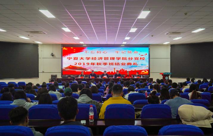 分党校2019年秋季班结业典礼。院党委书记张桓、副书记程胜利、新疆内派教师巴塔、会计学本科生党支部书记王嘉豫、经济学本科生党支部书记何韶华、工商管理本科生党支部书记姚硕及通过本期党课考试的入党发展对象和积极分子到场参会。本次典礼由何韶华主持。