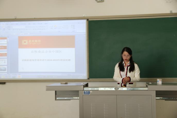 首先,同学们观看了正大集团的宣传片,朗朗的话语声传递着正大集团深厚的底蕴和实力。其次,由雷露莹开始细致讲解正大集团和本次招聘的要求,她从正大的七大业务所辖领域、现任领导人、农牧食品简介等方面介绍了正大集团的详细状况,体现了正大集团的知名度和影响力,从项目介绍、明确的发展路径、培训体系等方面详细地介绍了采购管培生的招聘条件和岗位情况,强调本次招聘目的是储备优秀人才。