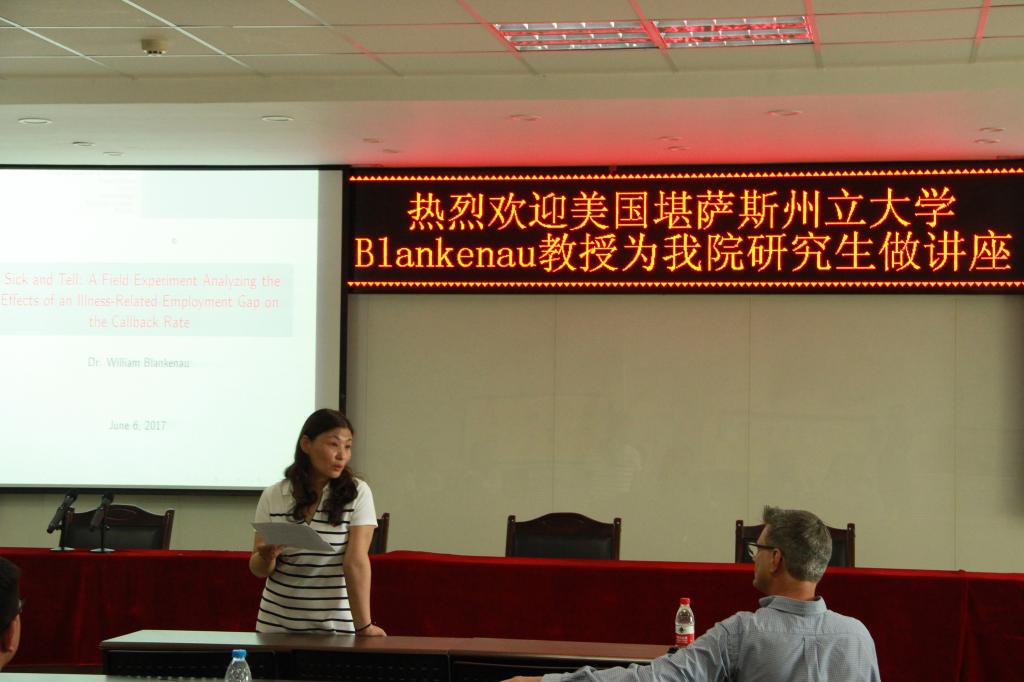 Blankenau教授通过一次关于分析疾病类就业缺口对面试通知影响的现场试验,提出研究问题和动机,在研究过程中采用分类回归的方程,主要选取生病类就业缺口、未作解释的就业缺口等解释变量对被解释变量——是否得到面试通知进行probit分析。分析结果显示,在总体上,就是否收到雇方反馈信息的可能性而言,从大到小分别为新失业人群、生病类就业缺口、未作解释的就业缺口;无论生病与否,失业的求职者都比没有失业的求职者更难收到雇方反馈;说明自己因病失业情况的求职者要比未作出任何解释的求职者更容易收到雇方反馈。讲座结束后,与会的部分教师与Blankenau教授一家合影留念。