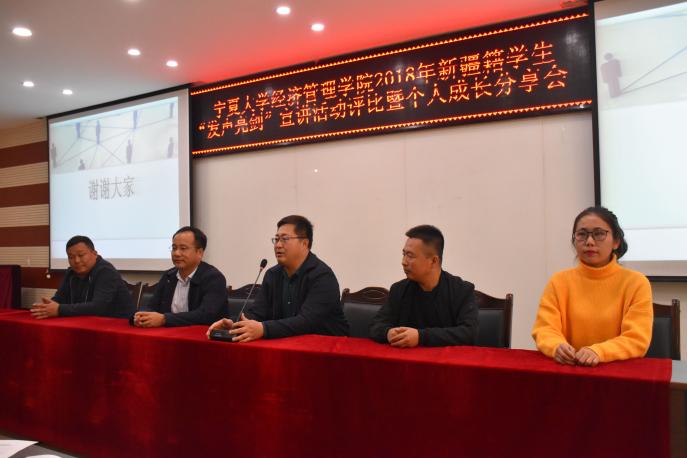 贺兰山校区文荟楼316室,麻将胡了22018年度新疆籍学生“发声亮剑”宣讲活动暨个人成长分享会如期举行,麻将胡了2党委副书记程胜利、李琦,学生工作办公室主任黄旭兴,新疆工作坊特派教师巴塔等人到场参会,全体新疆籍学生上台宣讲。