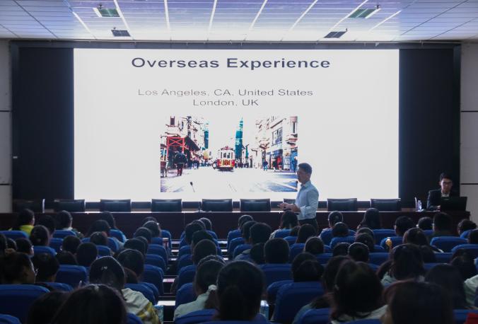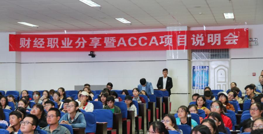 贺兰山校区文荟楼东报告厅,由中博教育组织举行的财经职业分享会暨ACCA项目说明会如期举行,特邀嘉宾中博教育执行董事师韫出席会议,拥有着丰富交传、同传工作经历的中博教育工作人员王锋担任主讲老师,全体2018级学生到场参加。