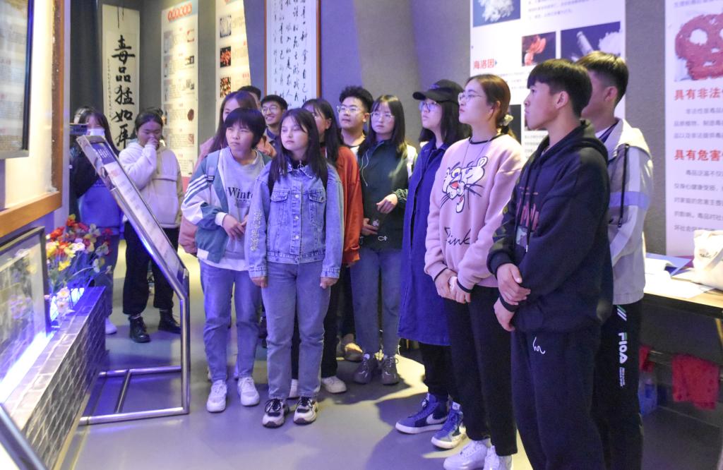 同学们随讲解员走进禁毒教育基地。映入眼帘的是“禁绝毒品,功在当代,利在千秋”的红色字样,展板上是中国近代以来的禁毒史,以及新中国成立后各届领导人在禁毒工作上的相关政策,展现了国家对于毒品坚决抵制的态度。继续向前走,蓝色灯光下投影出各类仿真毒品与吸毒工具。在走廊尽头,新型毒品的展板也开始出现,如冰毒、麻古等。展板上一一列举了吸食毒品的危害,触目惊心的画面为同学们敲响了远离毒品的警钟。在禁毒作品展区域,同学们翻看了以往学长学姐们禁毒知识考试的答卷,增长了禁毒的相关知识。