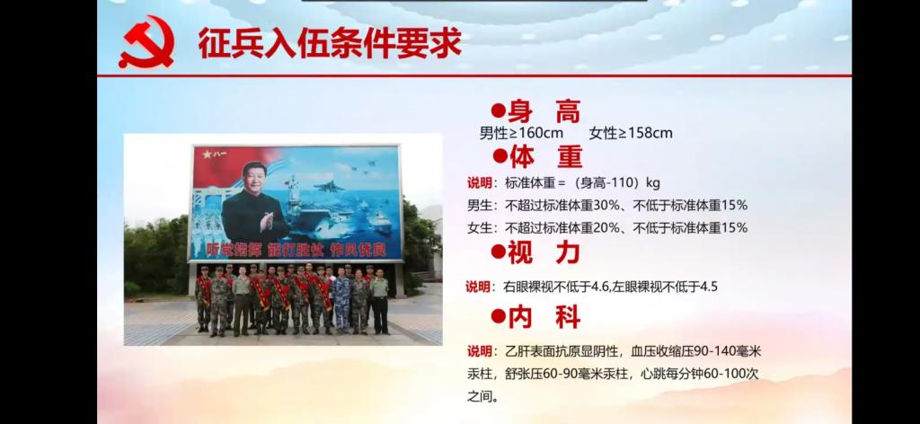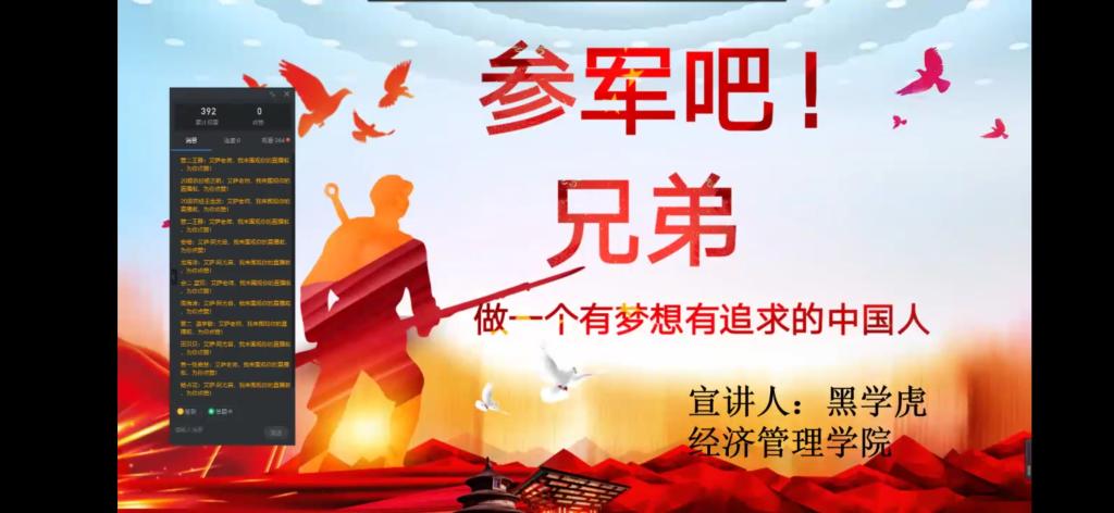 保卫国家终不悔,绿色军营献青春。黑学虎分享了他在服兵役期间的亲身经历和真实感悟,初进新兵连时,军队的内务及严格的军规对他的挑战,战友的团结与鼓励让他坚定了初心与梦想,生动展现出当代大学生敢于吃苦、勇于担当的品质。关于应征入伍的流程和政策,黑学虎从应征入伍的年龄标准、身体条件、视力要求、兵役登记、应征报名及应征地选择等方面对大学生征兵入伍政策做了详细解读。提到优抚优待政策,他就尊崇优待、入伍发展、复学升学、经济补助、就业创业五个方面进行阐述。黑学虎就中国人民解放军违法违规行为注意事项主要讲了征兵入伍的政治条件和有服兵役义务的公民的违法违规行为及其承担的法律责任追究。会议最后,各位老师希望同学们作为新时代的接班人,可以增强自身的使命感和责任感,积极响应党和国家的号召,踊跃报名参军,携笔从戎,保卫国家。