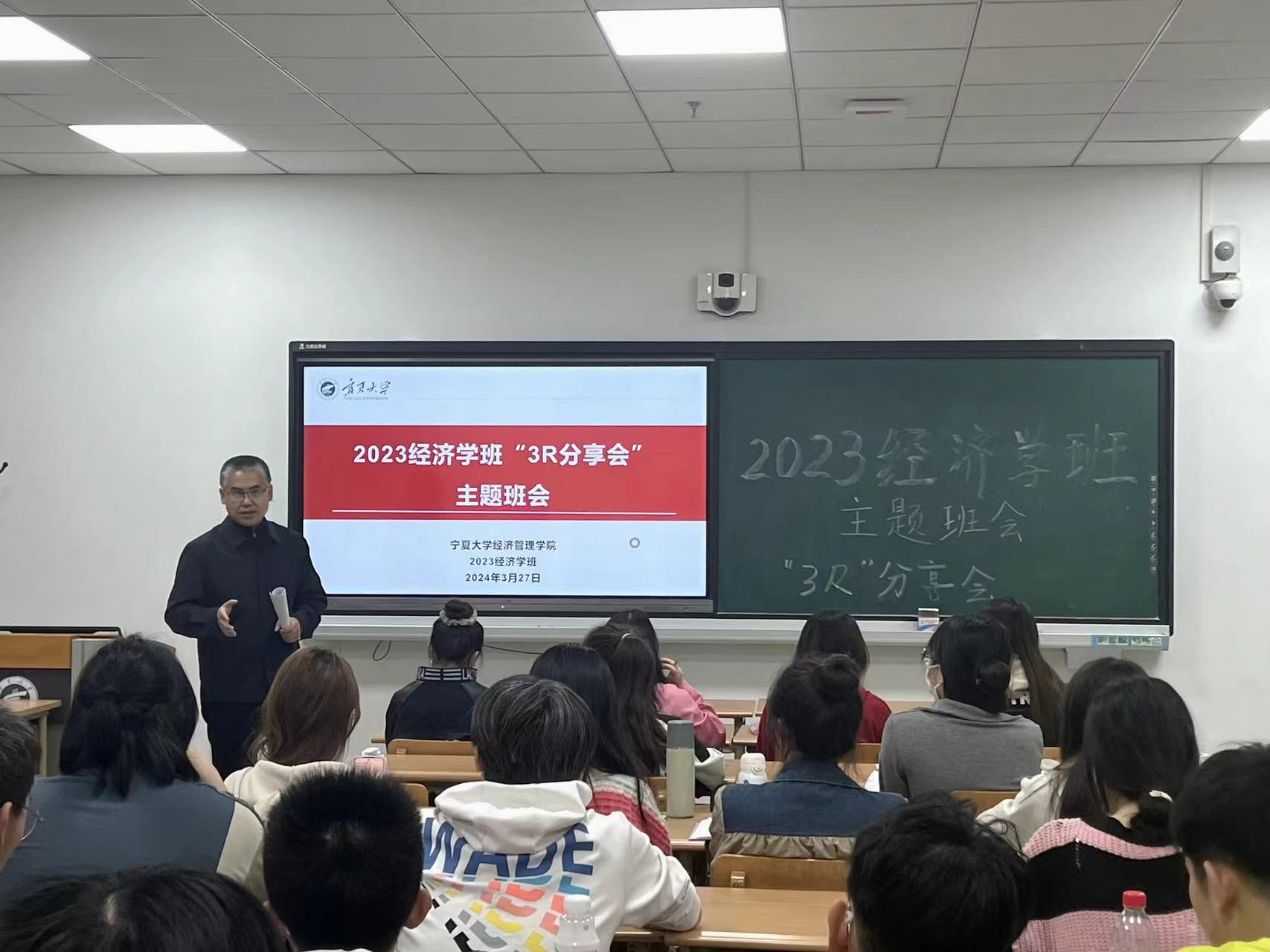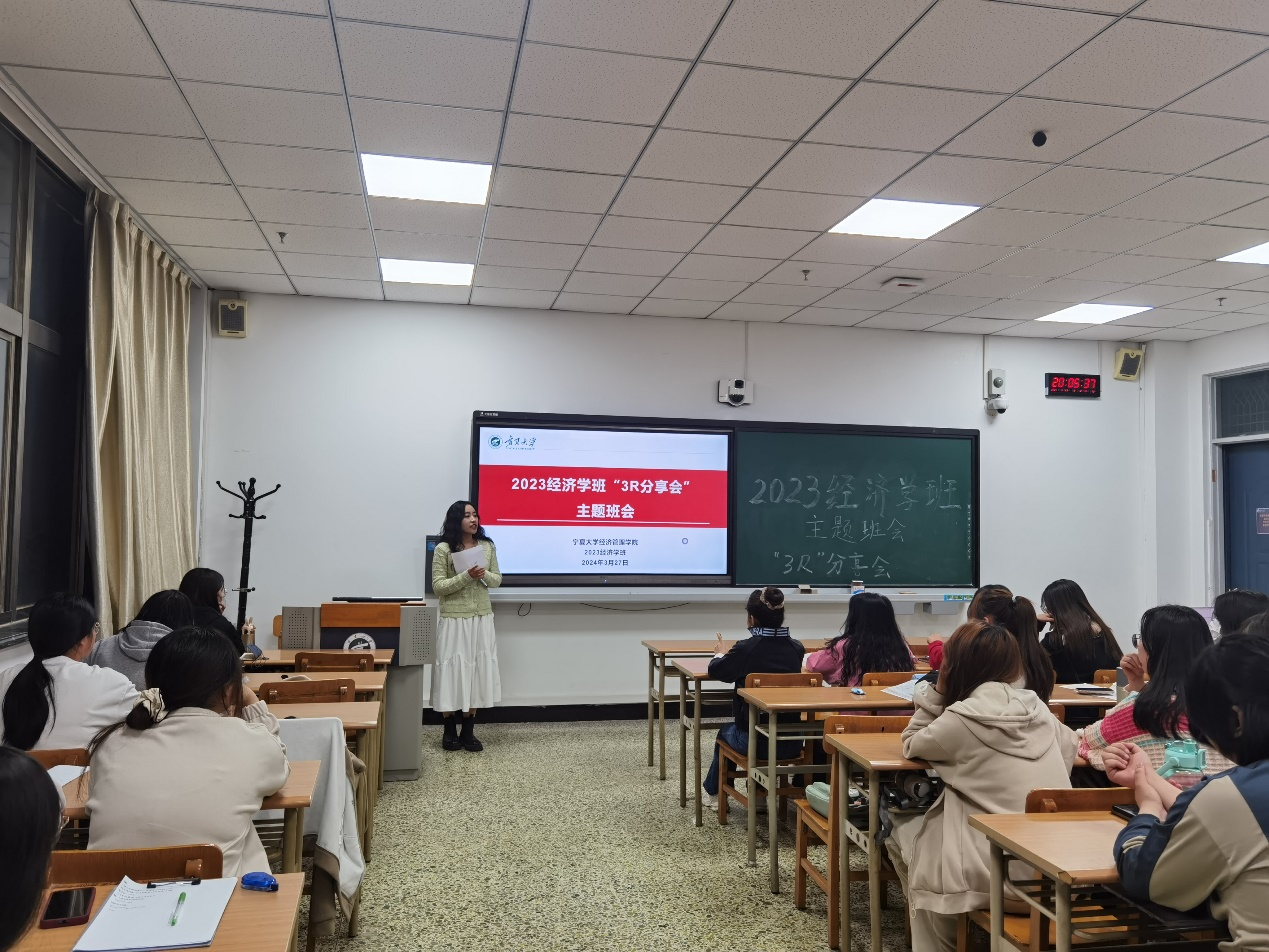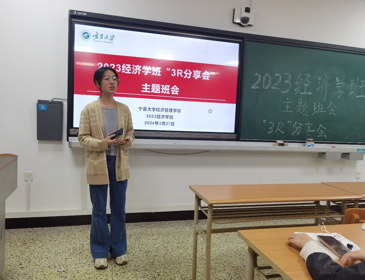 2024年3月27日,在兰山一教D404召开经济学班主题班会,班会的主题定为3R(Reading,Research,Report)分享会。班会上,政治经济学专业研究生张淼和刘星源围绕大学生活中的三件事:读书(Reading)、调研(Research)、写报告(Report),分享了她们的成长经历和学习感悟。班主任杨国涛老师策划和主持了班会。