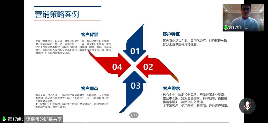 大赛前期准备工作全面准备就绪。在展示创意方案环节,参赛单位通过PPT、视频和讲解等不同方式之间的有机结合,展示了本单位的参赛创意方案。其中,宁夏银行科技先锋队践行深耕市场、服务民生的理念,开展了大量的市场调研,开拓了不同的市场产业,其市场营销成绩斐然;人保财险智联队则与公安官网合作,以交通为切入点,既保障了客户的信息安全,又增加了企业与客户的互动频次;工商银行宁夏分行科技e先锋队开发的“公民党建云平台”是通过互联网大数据精准定位客户,精准提供服务,精准分析信息来扩大影响、获取收入,他们自己建设运营并组建专队负责信息调研,能够迅速地掌握市场信息;中国银行宁夏分行未来已来小队的“遇见Mr.right,遇见财富”项目通过线上AI全天候监控市场经济走势,线下理财经理提供专业咨询,为客户提供更加优质便捷的理财服务;南证怀远西路营销小组通过大数据分析调查了解了大众对互联网的使用习惯,也利用大数据开展营销活动、传递金融知识、宣传投资理念、提供金融服务,引导人们以更加理性的态度参与融入金融市场;交通银行宁夏分行代表队从数据分析入手发现问题进而制定目标,又以实际案例作比,说明了交通银行的行动计划,旨在创造社会效益……评委老师对参赛选手的项目进行了犀利的点评提问,也饱含期望与肯定地提出了后续发展建议。各个参赛队伍紧扣比赛主题,以饱满的热情、清晰的条理讲述了各自团队的营销方案,对于评委的提问与建议,参赛人员认真回答虚心听取。