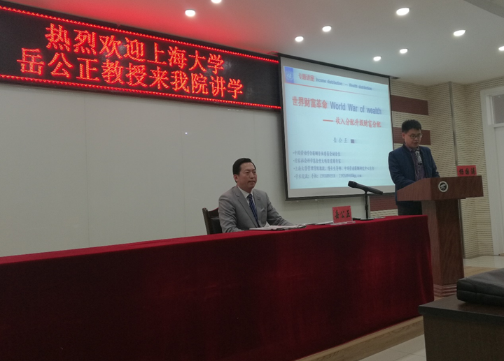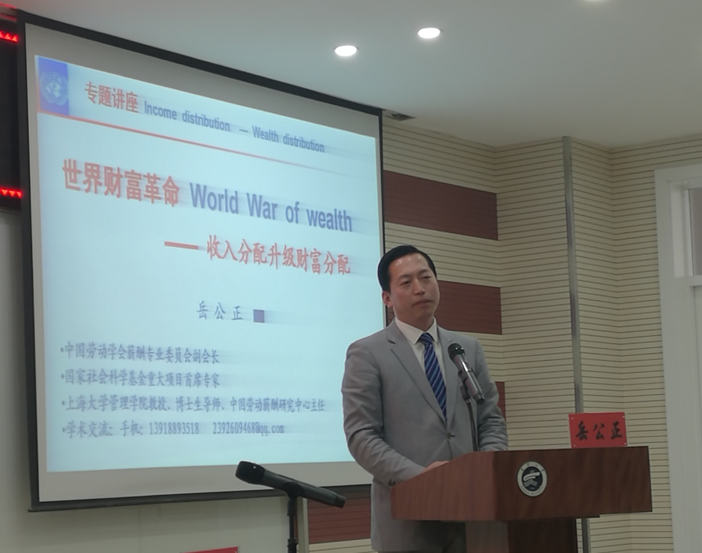 报告伊始,岳公正教授从宁夏的悠久历史及文化名人,引入了这次讲座的主题。随后,提炼出了中国收入分配不公五大表现:地区差距、城乡之间的差距、不同行业和所有制单位的差距,资产(房产)分配过多、劳动(薪酬)分配过少,国家和企业储蓄增速明显快于城乡居民储蓄增速,城乡居民财产分布差距过大,改革受益分配群体相对固定。岳教授也指出了中国收入分配不公的构因:自然历史和政策因素是历史原因,经济发展问题是根本原因,市场竞争是机制原因,体制与法治不健全是法制原因。最后,系统总结出了财富分配理论创新的“五维分析法”,即从居民收入、国民收入、财产、资源、社会权益等五个维度探究财富分配问题。岳教授表示,如今的人们在争夺财富、竞争财富中,财富战争是不可避免,这是当今世界发展的走向与趋势。