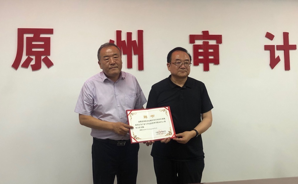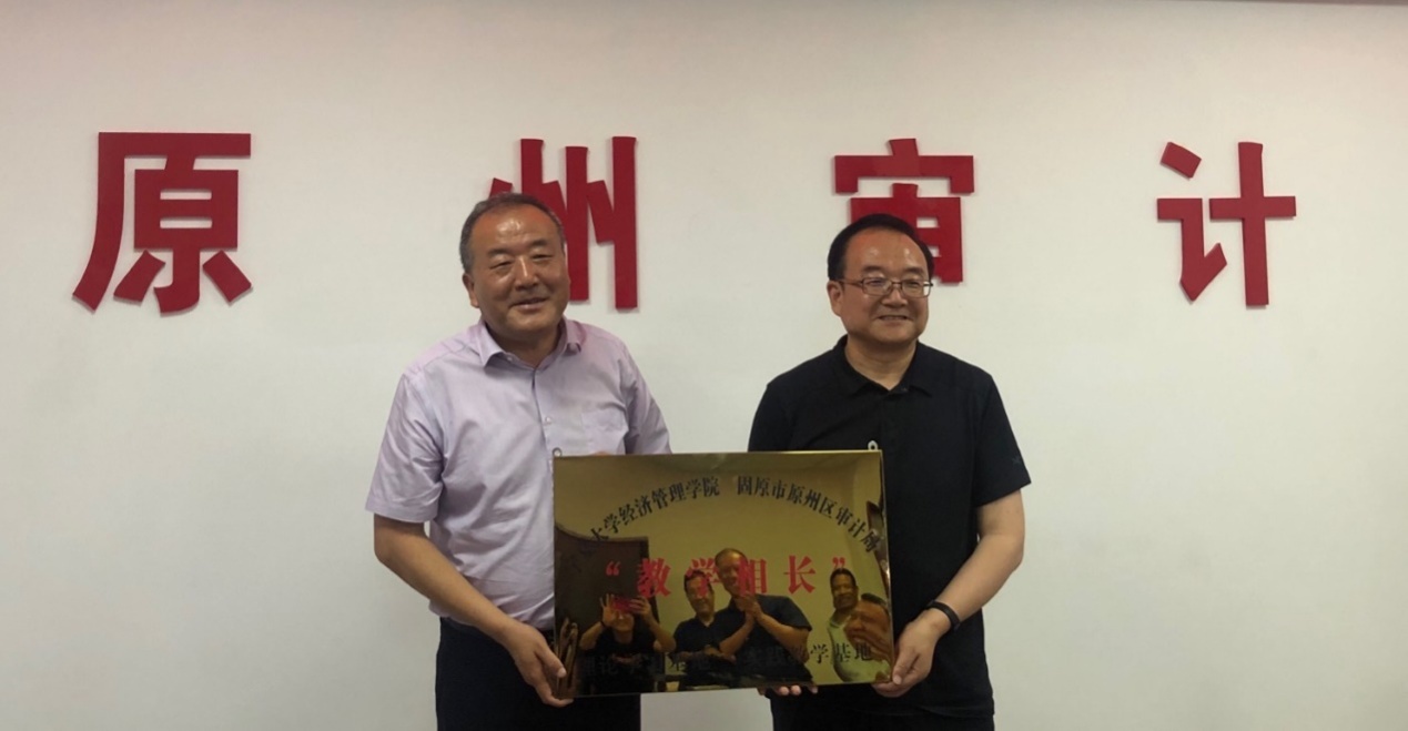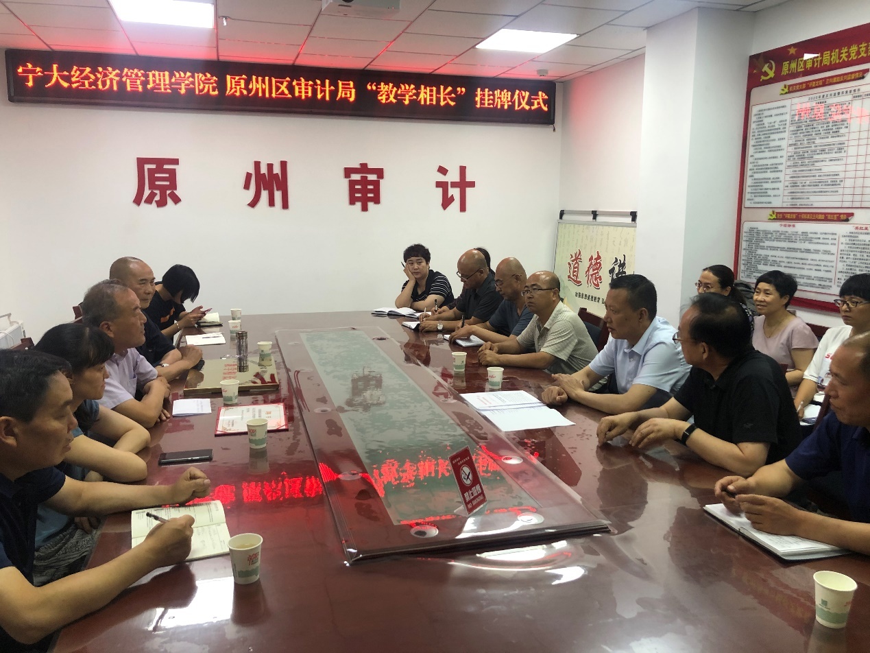 党委书记朱伟和固原市原州区审计局局长张晓龙在参会嘉宾的见证下进行了“教学相长”的挂牌仪式,并为局长张晓龙颁发了导师聘书。