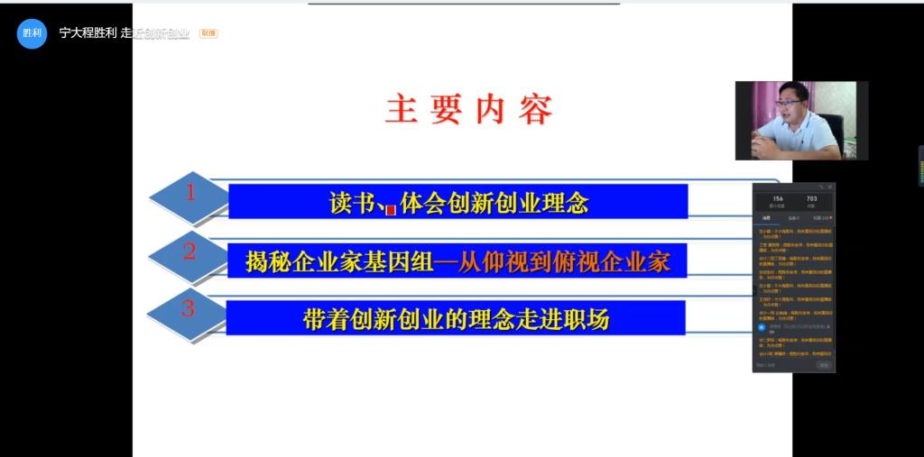 讲座伊始,他向同学们推荐了几本适用于培养创新创业思维的书籍,从创业活动、创业者、企业家精神、创新四个方面举例说明了部分书籍所对应的内容。他从人类技术演变的角度提出“人类社会的每一次进步都是一个创新的过程”,在回答钱学森和李约瑟之问中强调了创新的重要性。第二部分,程胜利以我国优秀企业家为例,从“是什么”“为什么”“怎么办”三方面发问引起同学们思考,总结了企业家的“情商”“知识”“环境”三个成功要素。通过对100位知名企业家的采访进行分析,他总结了追求成就、创新能力、风险承担、自信、人际关系等企业家核心特征,并得出“情商”比重占成功要素的绝大部分这一结论。第三部分拉进现实,从即将毕业的同学们身上出发,他分析了今年毕业生们严峻的就业现状,还展示了写给大学生们的就业七字诀,并从初入职场的理想薪酬作为切入点,描述了就业后将会面临的现实。他指出,凡事预则立不预则废,要树立科学的创新创业观,自觉遵循创新创业规律,积极投身创新创业实践。