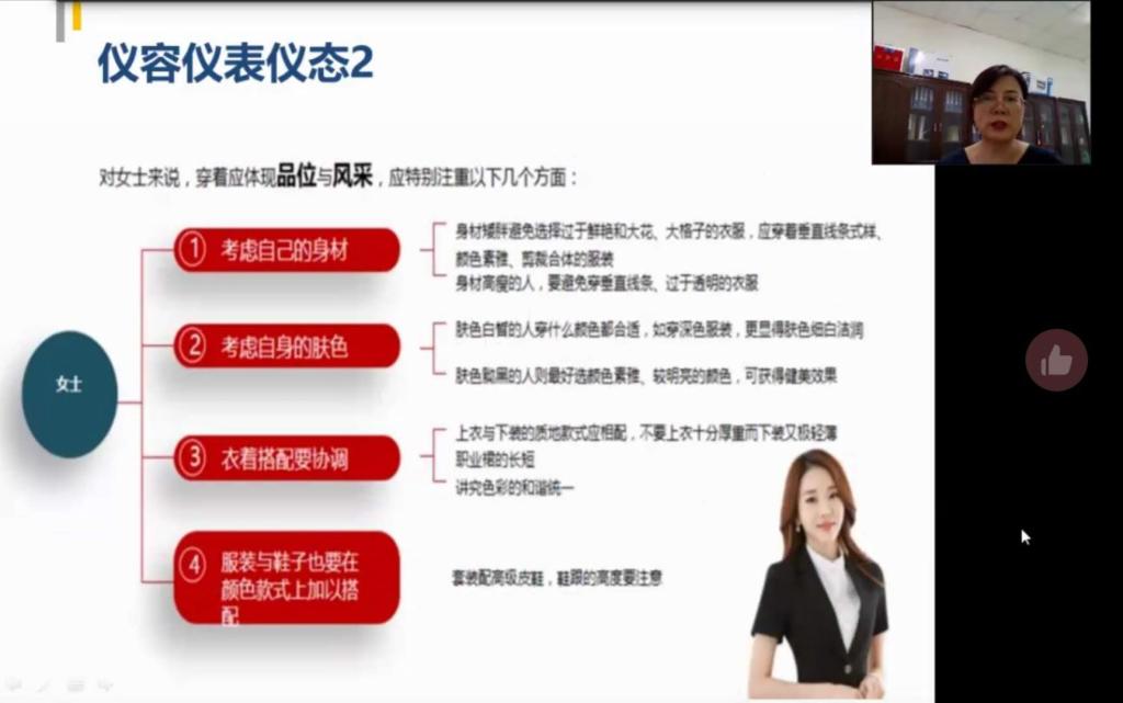 谈及面试方面的技巧和攻略,潘瑞为同学们提供了关于面试前的准备、面试中的注意点以及面试结束的后续工作的建议,包括带上简历、单独面试、遵守时间、调节情绪、自我介绍、听清问题、敢于说不知道、适时告辞、礼貌再见等。其中潘瑞强调了自我介绍,她讲到自我介绍要提前准备1、3、5分钟三版,除此之外,可通过采取讲述自身经历和故事来生动地展示岗位适配性和个人特色,从而增加面试通过率。得体的形象有利于建立良好的第一印象,于是潘瑞重点从穿着和坐姿两方面为同学们详细讲解了面试时的形象管理。