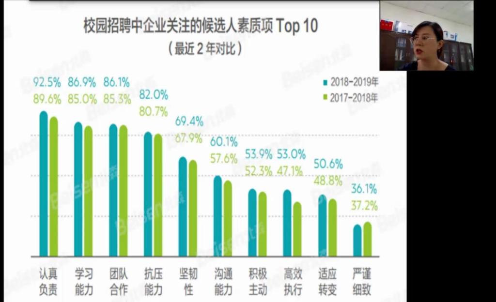 本次讲座围绕“企业校园招聘方向”和“面试全攻略”两方面展开。现如今,校园招聘已成为一种常见的招聘方式,是为企业提供“高潜人才”的通道,也是众多企业招揽人才的“兵家必争之地”。潘瑞从“企业认可的人才获取渠道”、“企业HR和毕业生对人才评价方式的认可对比”、“企业HR和毕业生对人才标准评价点的对比”以及“校园招聘中企业关注的候选人素质TOP10”四个方面,给予了同学们“毕业生意愿要与企业标准相匹配”的认知。聚焦企业在校园招聘中选用人才的测评工具,潘瑞提到,企业更倾向于招聘与岗位或者企业适配度高、心理风险低、学习能力好、专业技能强及个性好的人才,并建议同学们要注重软技能和硬技能共同培养,双管齐下。