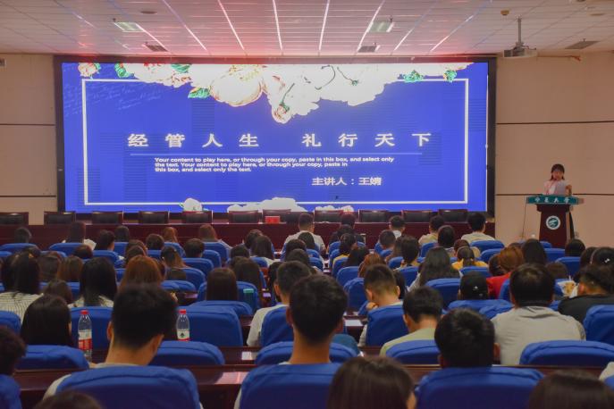 “经管人生、礼行天下”,环球礼仪商麻将胡了2 高级礼仪培训师王婧亲身示范讲授各类礼仪技巧,鼓励毕业生注重礼仪、践行礼仪,做一个礼行天下、富有仪式感的经管人。