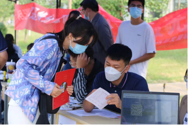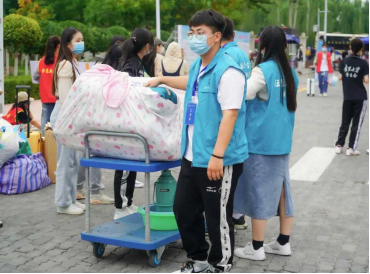 志愿者马甲独特的蓝让人眼前一亮。志愿者们的身影穿梭在门口搬运行李的路上、穿梭在引导新生报道的路上、穿梭在去新宿舍的路上。