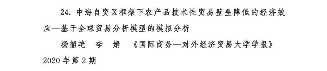杨韶艳参与的论文《中海自贸区框架下农产品技术性贸易壁垒降低的经济效应——基于全球贸易分析模型的模拟分析》荣获二等奖;