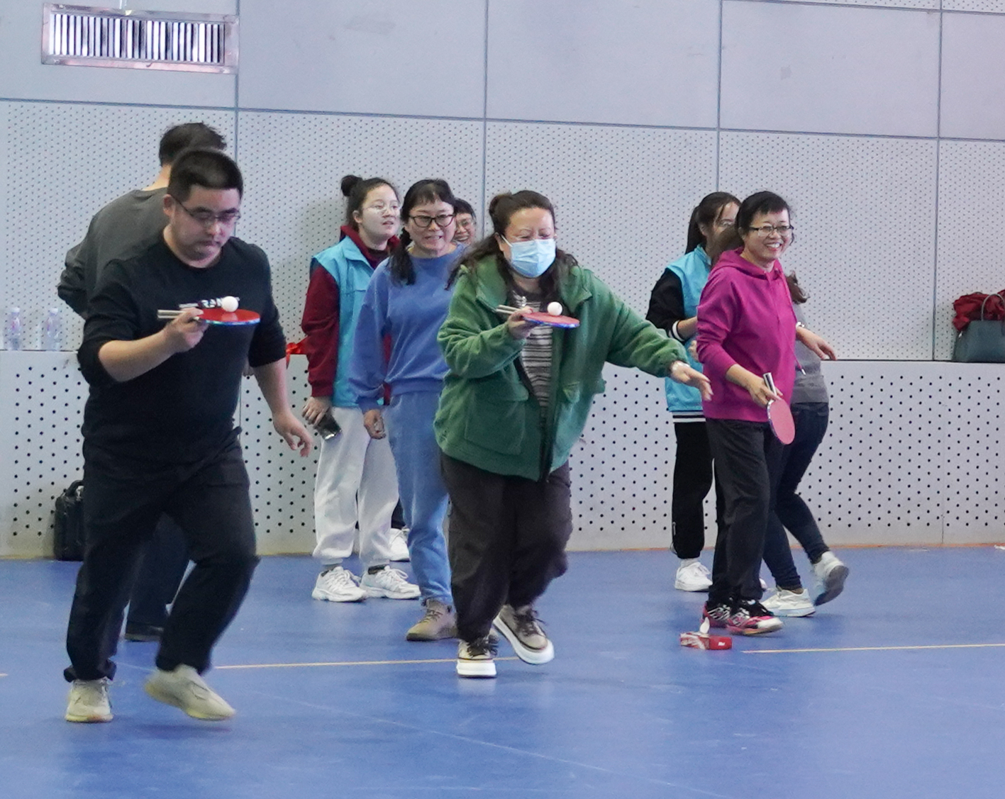 本次联谊活动比赛项目融合了体育运动和趣味游戏于一体,设置了“掂乒乓球接力”“两人三足接力”“跳棋”“你比我猜”等7个项目,这些项目,既考验速度,又考验团队协作能力,整个比赛紧张激烈又趣味横生,联谊活动现场气氛热烈。