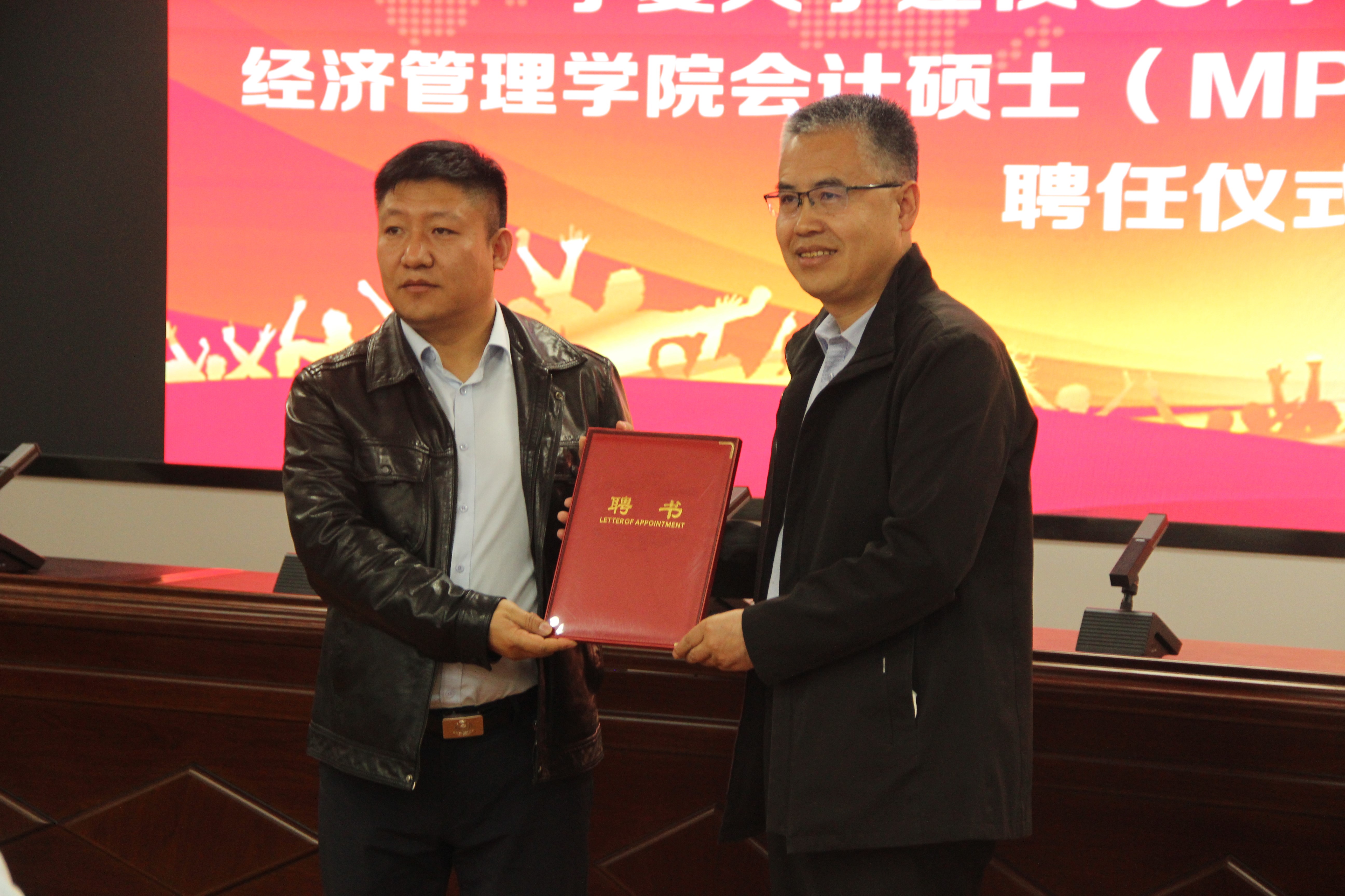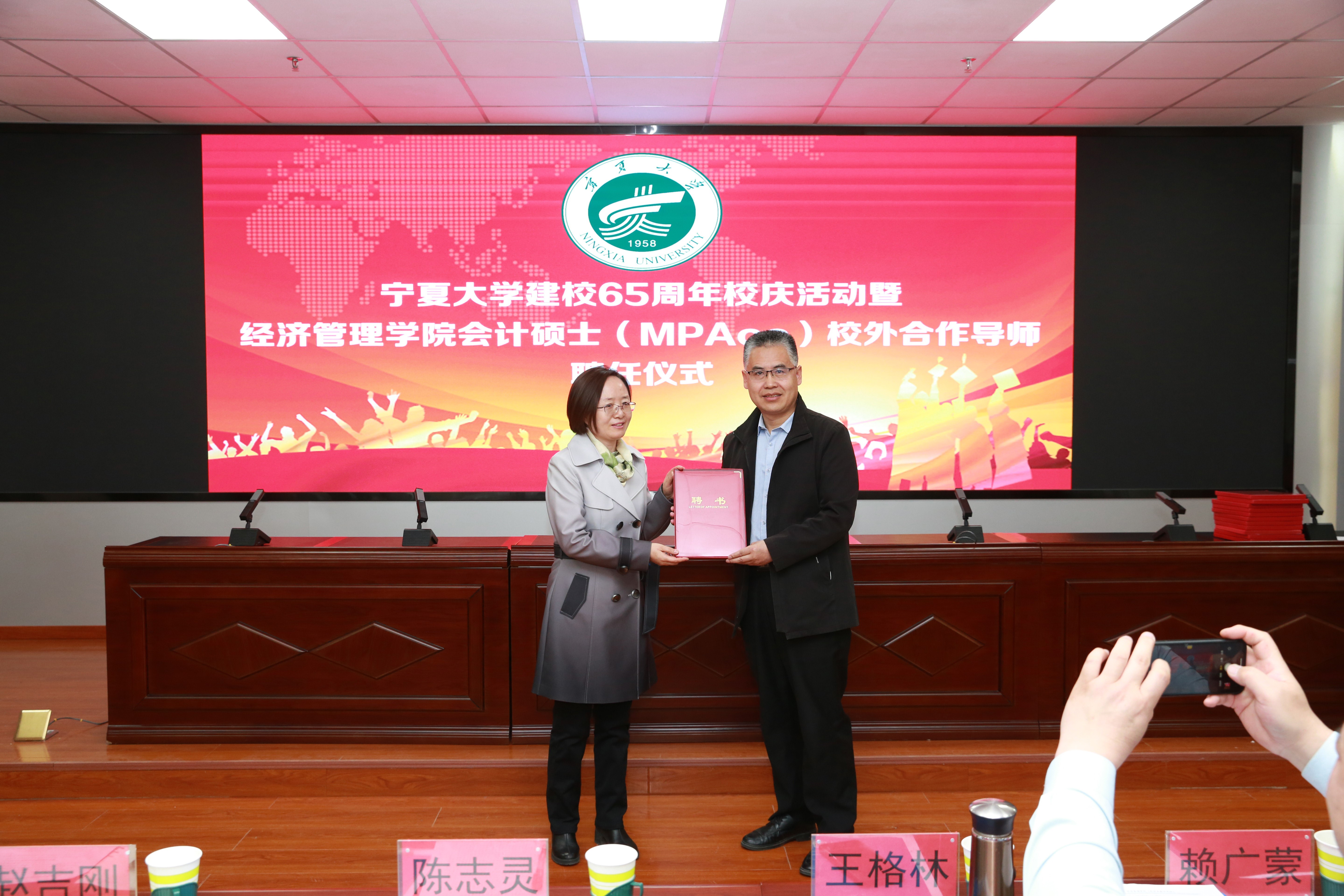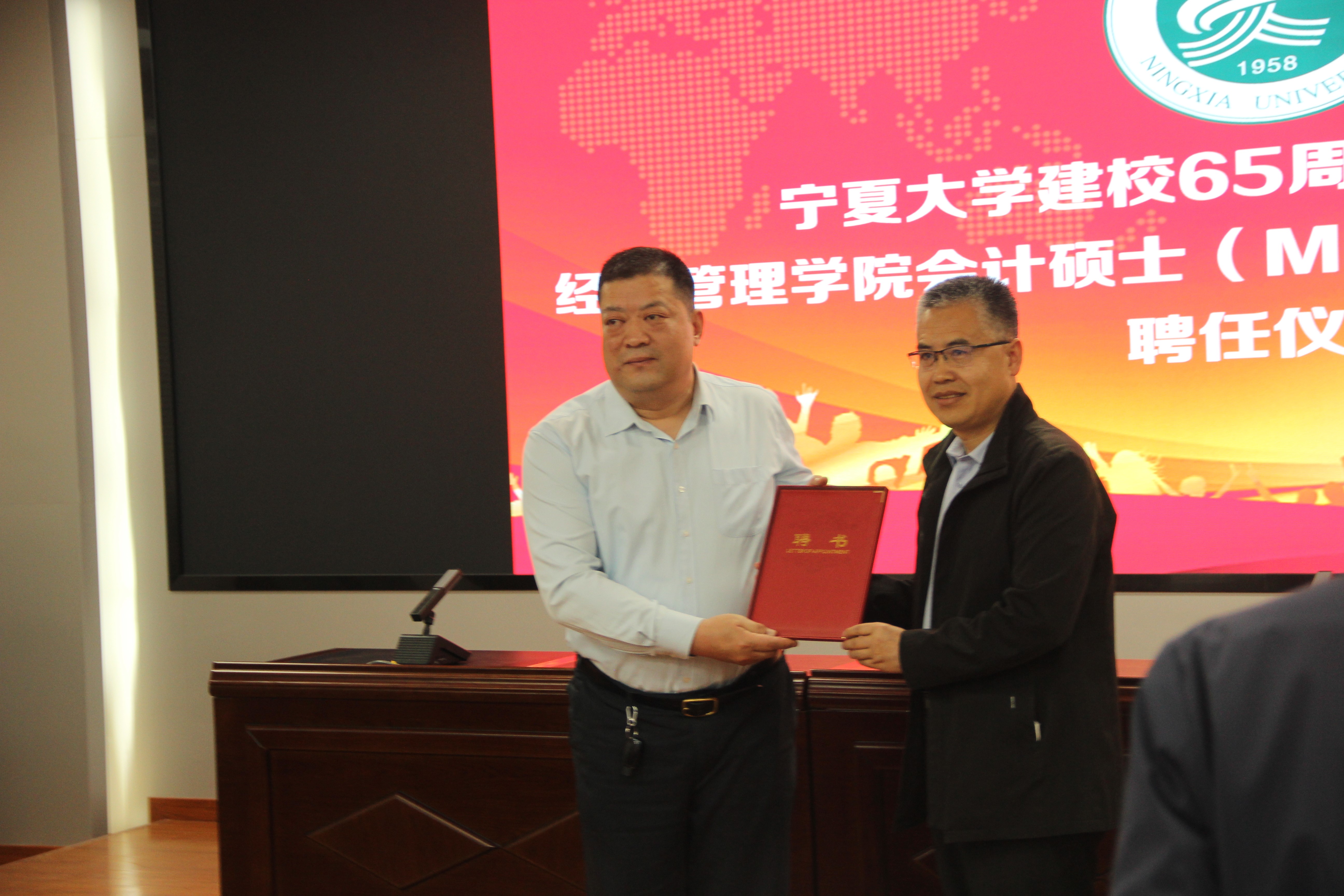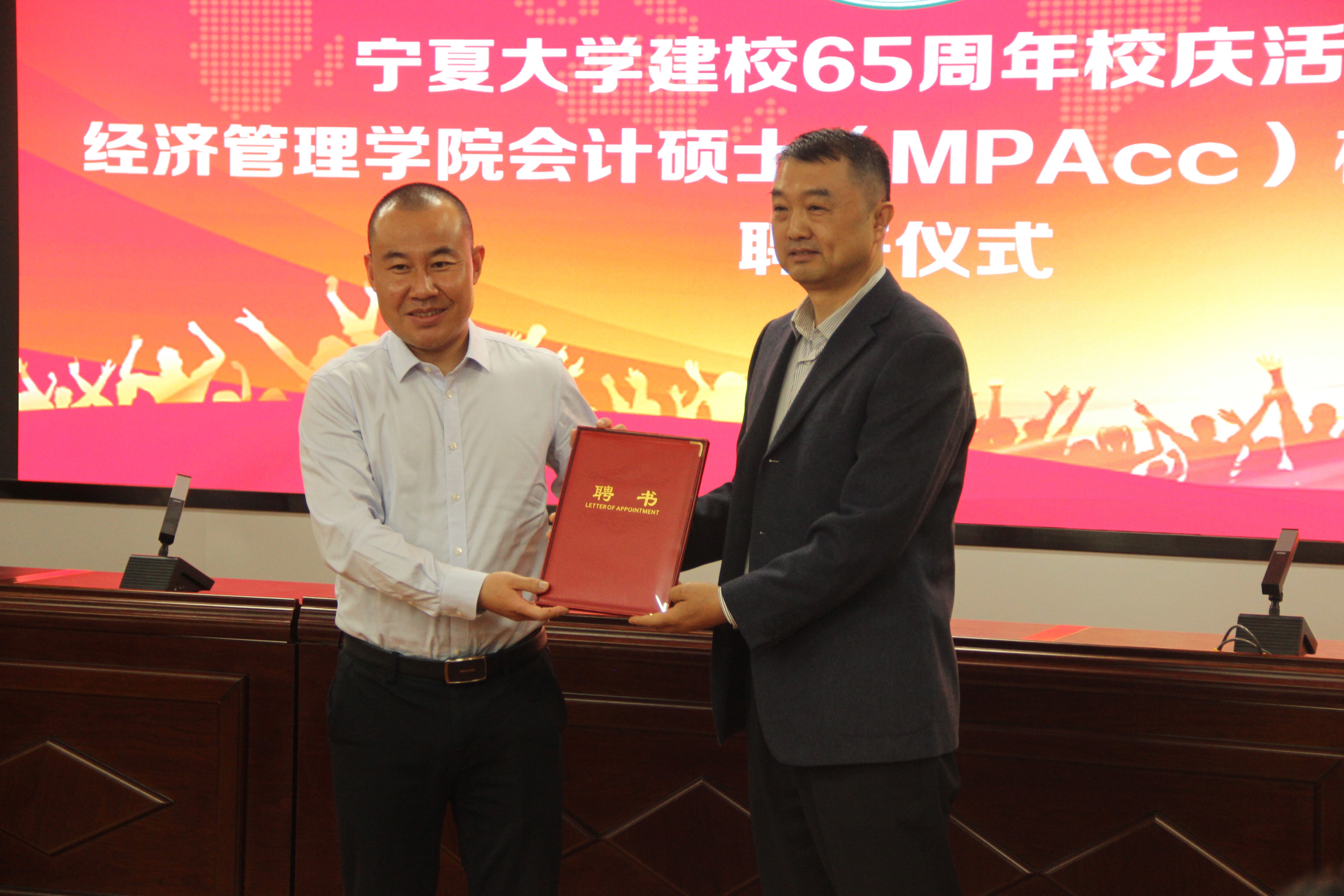 领导为校外导师颁发聘书。宁夏水投云澜科技股份有限公司董事长陈志灵,宁夏西北明天科技股份有限公司董事长赖广蒙,宁夏昊源联合会计师事务所所长牛建强,宁夏农垦集团和旅游集团外部董事王格林,自治区国资委党群部副处长赵吉刚,天华(宁夏)会计师事务所首席合伙人王海智,宁夏银行石嘴山分行副行长丁自明,中和资产评估有限公司宁夏瑞衡分公司副总董文忠,信永中和会计事务所银川分所合伙人梁建勋,宁夏宁东融资担保有限公司综合办公室主任龙鹏程,上陵牧业董事长秘书沈致君,宁夏昊源联合会计师事务所项目经理张凤莉,宁夏银行股份有限公司资深营销专员夏会云,受聘成为麻将胡了2会计硕士研究生校外导师。