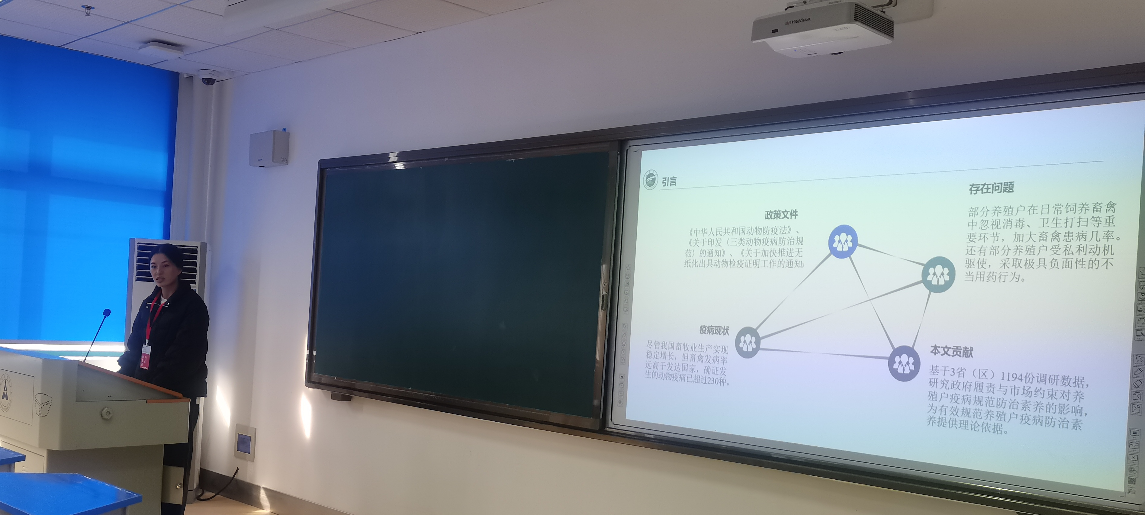 研究生米文娟报告论文题为《政府履责、市场约束与养殖户疫病规范防治素养》。养殖户是畜牧业生产的主体,在动物疫病规范防治过程中充当着关键角色。该文基于陕西省、甘肃省、宁夏回族自治区1194份实地调查数据,实证检验了政府履责、市场约束对养殖户疫病规范防治素养的影响。研究结果表明:政府履责与市场约束分别对养殖户疫病规范防治素养具有显著正向影响,政府履责与市场约束力度越大,养殖户疫病规范防治素养越高;市场约束参与后,政府履责作用依然显著,政府与市场协同治理对养殖户疫病规范防治素养具有显著正向影响;市场约束在政府履责对养殖户疫病规范防治素养影响过程中存在显著正向调节效应,即政府与市场在促进养殖户疫病规范防治素养时存在互补作用。