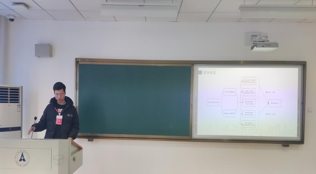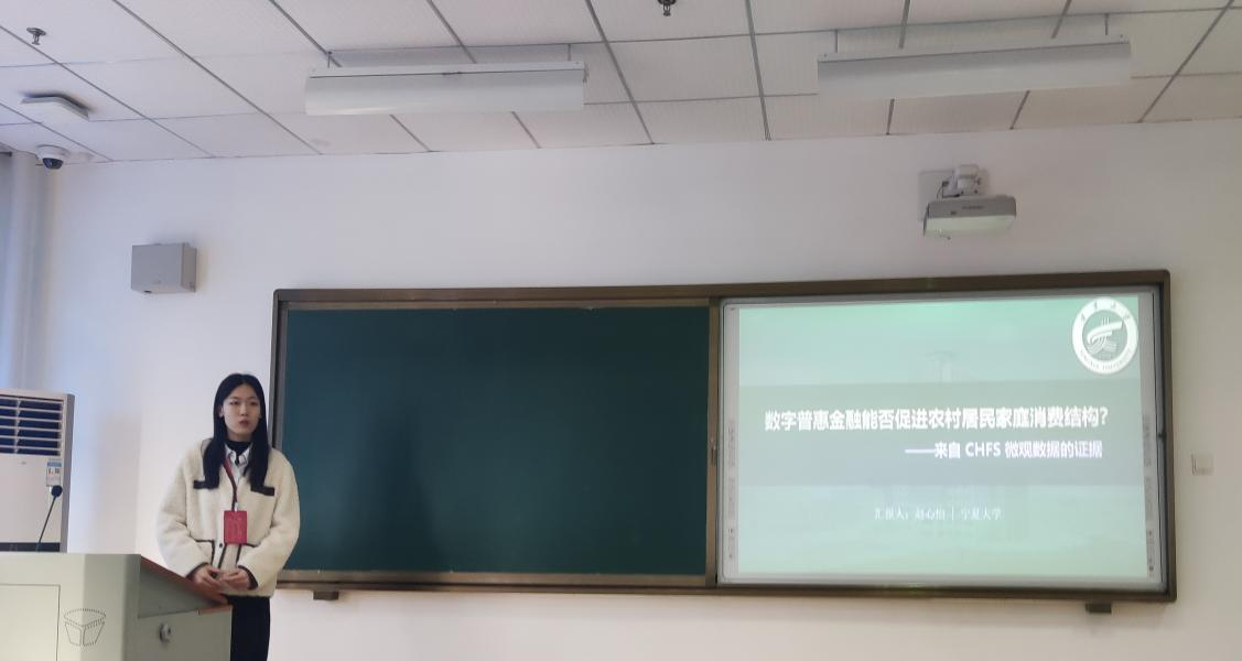 研究生赵心怡报告论文题为《数字普惠金融能否促进农村居民家庭消费结构?——来自CHFS微观数据的证据》。与城市相比,中国农村地区的内需不足情况仍比较严重,在此形势下,刺激农村地区消费升级是当前亟需解决的问题。该文采用双重差分法(DID)从微观视角考察数字普惠金融的发展对农村居民家庭消费水平和消费结构的影响。研究结果表明:数字普惠金融能够显著促进农村居民家庭总消费水平,且对不同层次消费影响有所差异;数字普惠金融对不同类别消费支出影响作用存在异质性,对除居住支出外其他七类消费支出均有显著促进作用,有利于农村居民家庭消费结构优化;影响机制方面,数字普惠金融可以通过增加收入来促进农村居民家庭消费,但影响力较小。