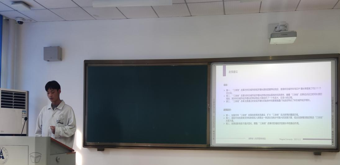 研究生胡烨君报告论文题为《“三块地”改革对区域经济增长的带动效应》。该文以经济增长速率为切入点,基于2009—2020年中国283个城市的面板数据,采用倾向得分匹配—双重差分法研究了“三块地”改革对区域经济发展的影响,为推动试点城市经济增长提供科学依据。研究结果表明:第一,“三块地”改革对所在城市的经济增长具有显著带动效应,这一结论在进行稳健性检验后仍然成立。第二,“三块地”改革对所在城市经济增长的带动效应具有时间异质性。第三,“三块地”改革主要通过改变经济增长初始条件和要素数量扩张途径带动了所在城市经济增长。