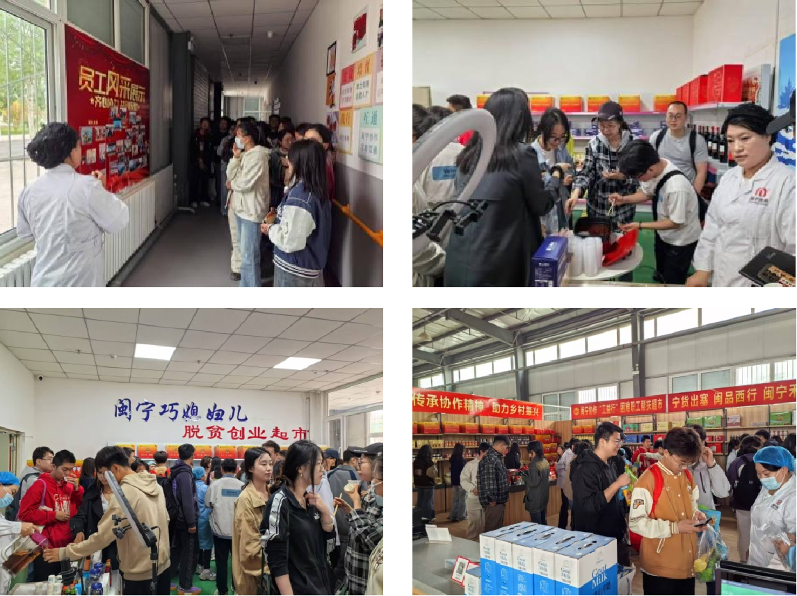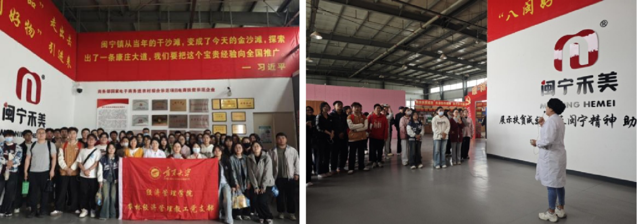 第二站,师生们来到永宁县闽宁禾美电商帮扶车间。2019年该车间在“中国减贫地标”闽宁镇成立,是宁夏第一个以电商为主题的帮扶车间,2024年被评为“第五届全球最佳减贫案例”。此地不断上演着移民妇女创业致富的精彩故事,“闽宁巧媳妇”直播带货团更是成为“以工代训、订单培训”的一道亮丽风景线。师生们目睹了创办人徐美佳从“大学生村官”成长为“党员致富带头人”的奋斗足迹,见证了“留守妇女”蝶变为“网红带货主播”的非凡历程。“闽宁巧媳妇”传承着脱贫攻坚的不屈精神,推“宁夏优品”引“八闽好物”,创造闽宁协作产业帮扶的新业态,解决移民妇女就近就地就业,助力移民增收致富。