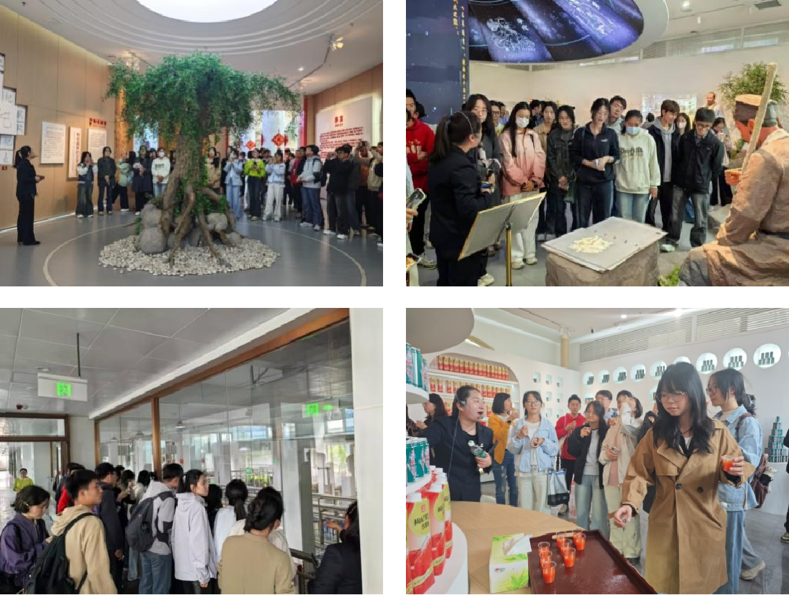 第一站,师生们走进宁夏沃福百瑞枸杞产业股份有限公司,深入了解企业从枸杞有机种植、科技研发到国际标准输出的全产业链创新实践。枸杞作为传承千年的养生珍品,同时也化身为践行环保理念的绿色使者。企业采用现代化农业技术致力于打造膳食产品、药食产品和特色食品矩阵。枸杞馆以“历史、养生、种植、贸易、科技、文化”六大主题布展,凭借全息投影、多媒体互动等技术,栩栩如生地还原了枸杞从古至今的演变历程,详尽展现了企业“科技赋能+标准引领”的成功经验。师生们沉浸式体验扁鹊互动问诊、解锁枸杞密码、观摩生产车间、品尝枸杞饮料,巧妙地揭开了枸杞从土地到舌尖的致富之道。