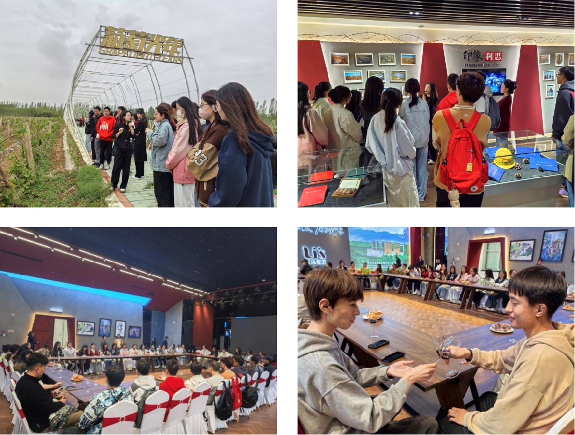 第三站,师生们步入距离银川市区最近的酒庄——利思酒庄。该酒庄2013年建庄,2021年晋升为宁夏贺兰山东麓产区最高等级的二级列级酒庄,是一家集葡萄种植与葡萄酒生产、园林生态、餐饮娱乐、观光民宿、休闲度假为一体的文旅全功能型葡萄酒庄。师生们在酒窖探访了葡萄酒的酿造工艺,在种植基地聆听了酿酒葡萄的种植状况、技术与品种特色,在文化中心图文并茂地了解酒庄的历史脉络、文化底蕴及卓越成就。随后在专业讲解员的引导下,师生们认真学习葡萄酒的品鉴技巧,细细品味了利思智霞多丽干白葡萄酒和西隆赤霞珠干红葡萄酒两款产品,感受不同年份、不同葡萄品种所带来的独特风味。