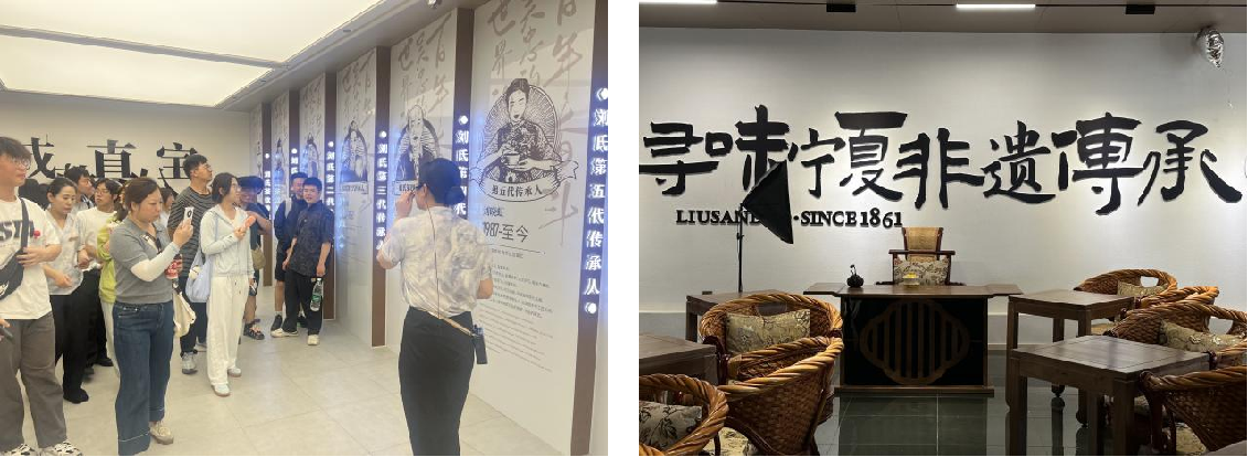 第二站,师生们来到了吴忠刘三朵八宝茶体验馆。这座体验馆融合了八宝茶文化展示、传统工艺体验与现代茶饮研发等多重功能,成为传承和发扬地方传统文化的重要平台。八宝茶以枸杞、桂圆、菊花、红枣、玫瑰、杏干、核桃、葡萄干等八种珍贵食材为主要成分,每一种原料都经过精挑细选,结合了丰富的营养价值和独特的滋味,因此被誉为“塞上养生瑰宝”。它不仅仅是一种饮品,更承载着深厚的文化内涵和历史积淀。在参观过程中,讲解员向师生们介绍了刘三朵八宝茶体验馆的党建工作。在这一过程中,师生们不仅体验到了传统茶艺的魅力,还加深了对宁夏独特地方文化的认识。通过亲身参与,大家真切感受到“一盏八宝茶、半部丝路史”的文化张力,进一步领略了八宝茶所传递的健康理念与浓厚的人文气息。