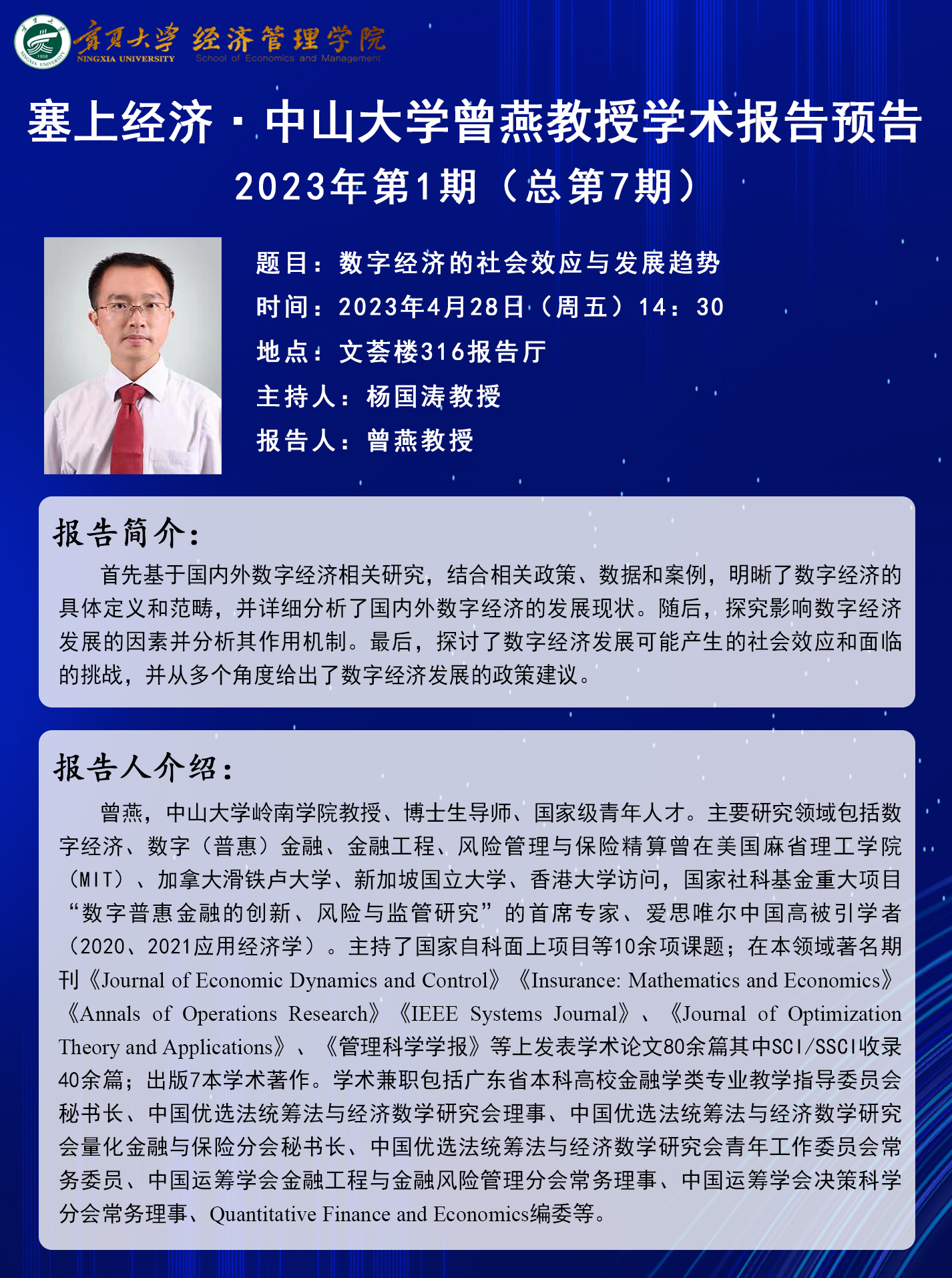 教授、博士生导师、国家级青年人才、。主要研究领域包括数字经济、数字(普惠)金融、金融工程、风险管理与保险精算曾在美国麻省理工麻将胡了2
