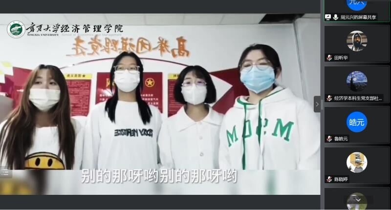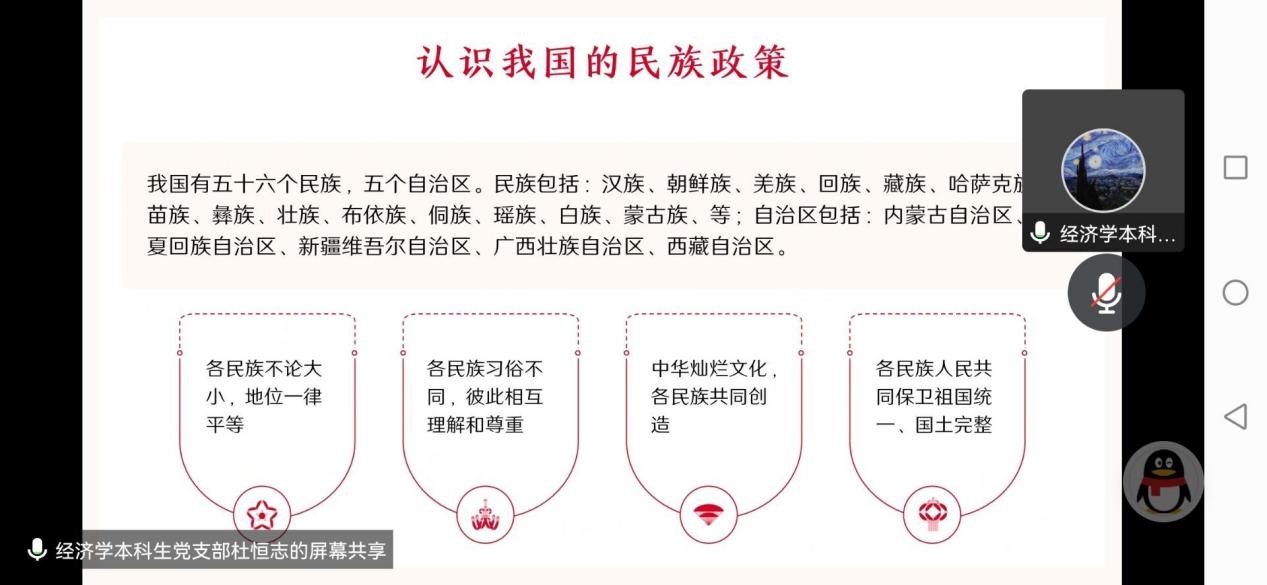 10月13日晚,“抓党建促团结进步·铸牢中华民族共同体意识”党日活动在线上顺利举行。经济学本科生党支部书记马静及经济学本科生党支部全体党员参会,会议由周元兴主持。