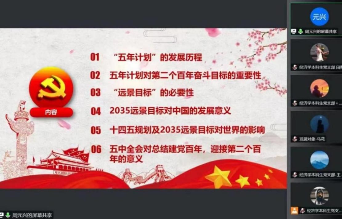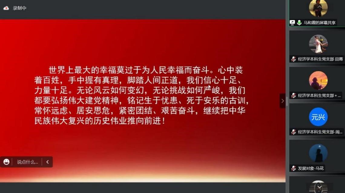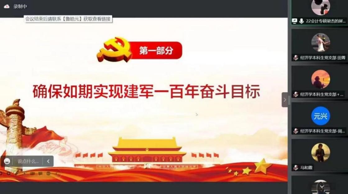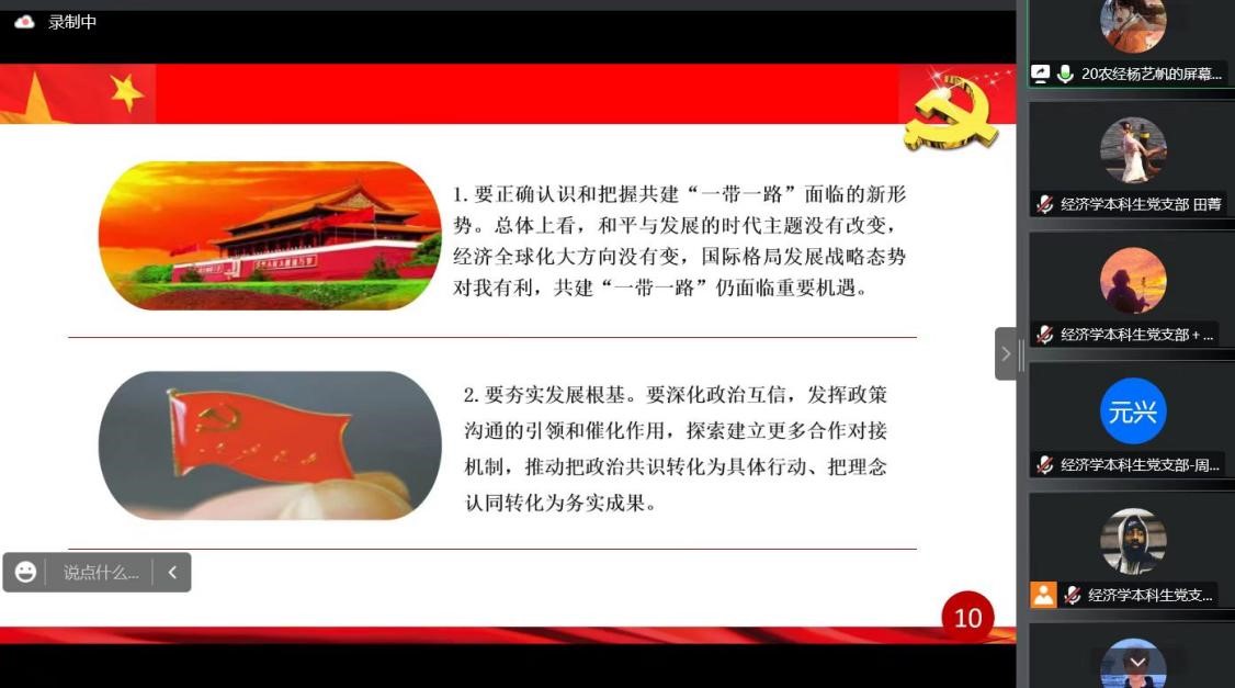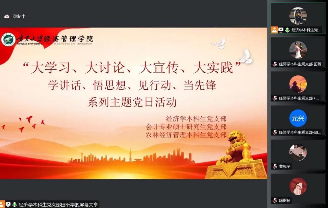 “大学习、大讨论、大宣传、大实践;学讲话、悟思想、见行动、当先锋”系列主题党日活动第四讲于线上顺利举行。经济学本科生党支部、会计专业硕士研究生党支部及农林经济管理本科生党支部参加本次会议。会议由田昕华主持。