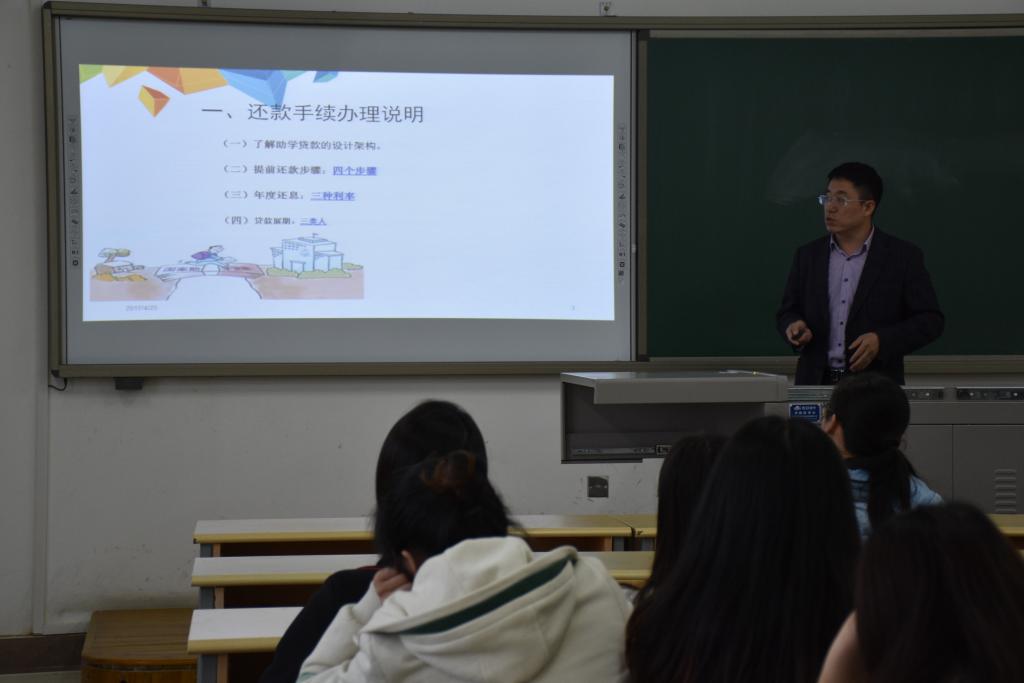 崔书记以毕业还款政策解读及诚信教育为主题,主要就银行针对大学生毕业后无法及时还款的情况,以及大学生对不还款的后果意识淡薄、对其惩罚措施不了解的现状进行重点分析与相关政策讲解。崔书记首先介绍了还款手续办理的明细,帮助大家了解助学贷款的设计构架、提前还款的四个步骤、三种年度还款利率以及不同类型的还款限期。随后崔书记宣读了毕业信息确认——致贷款毕业生的一封信和助学贷款代偿暂行办法的具体内容。最后,崔书记重点进行了贷款诚信教育,即违约责任教育。他介绍了包括将违约学生相关不良记录统计至中国人民银行个人征信系统中等五种严厉的惩罚措施。他呼吁大家铭记“诚实做人,诚信做事”的做人原则,珍惜来之不易的国家助学贷款,对学校的信任,银行的信任,国家的信任负责。