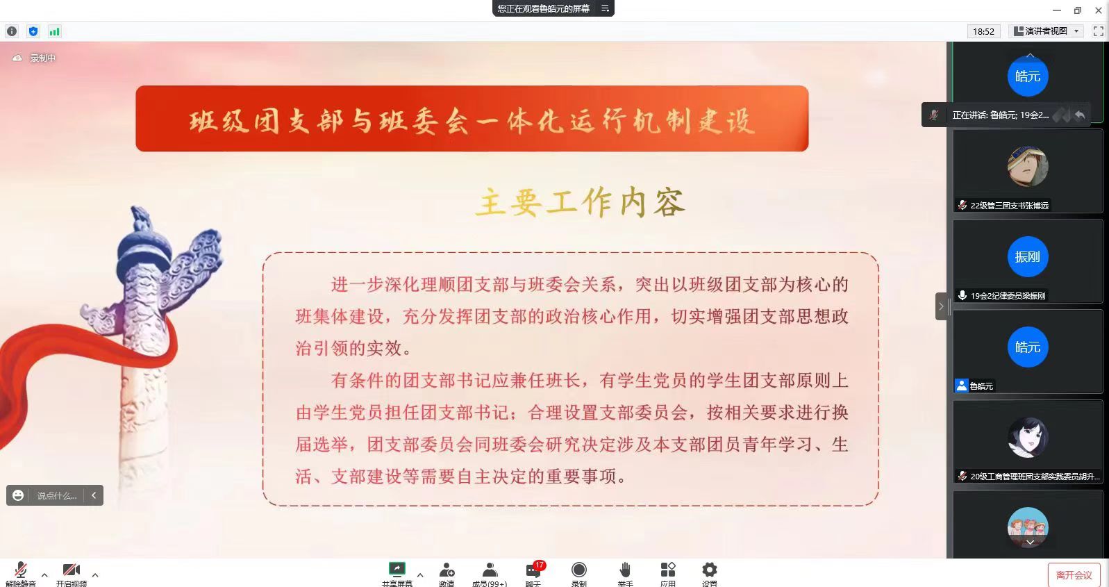 团委副书记孙文元,团委组织部、智课服务部、团委办公室全体成员及全体团支部支委参加会议。会议由鲁皓元主持。