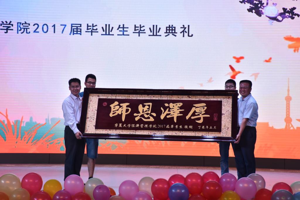 表彰结束后,最精彩的晚会节目来开序幕。开场一曲热烈奔放的爵士舞串烧《舞动青春》,如烈火青春激情四溢,点燃了现场气氛。一段《贺兰山下的那些年》的诗朗诵,青葱感伤,回忆悠长,令人不禁热泪盈眶,“请昂起头骄傲地走,因为你是经管人”道出观众心声。歌声飞扬,舞蹈绚丽,相声欢乐,现场气氛无比热烈。最后,在离别的歌声中,毕业典礼圆满落幕。