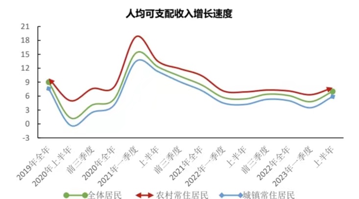 今年上半年,全区全体居民人均可支配收入13806元,同比增长7.0%。其中,城镇常住居民人均可支配收入19590元,增长5.9%;农村常住居民人均可支配收入6500元,增长7.8%。但2020年以来人均可支配收入增速呈现下降趋势,且2023年居民消费价格指数呈 现下降趋势,这意味着居民消费购买力下降,人们仍视当前存在一定程度的经济不确定性, 从而保持谨慎态度,限制了他们的消费意愿和边际消费率的提升。