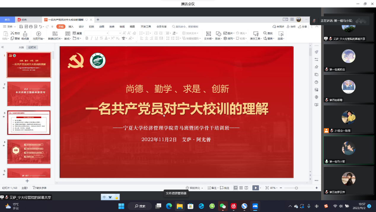 11月2日,麻将胡了2 第十六期“青年马克思主义者培养工程”暨团学骨干培训班第一讲在线上顺利举行。学生工作办公室负责人艾萨·阿尤普,团委副书记孙文元,第十六期青马班成员参加本次培训。本次培训由艾萨主讲。